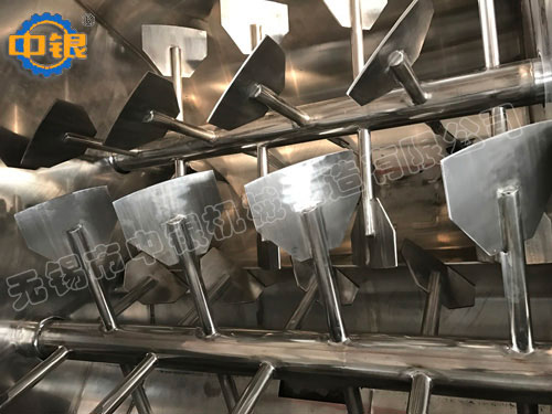該機臥式筒體內(nèi)裝有雙軸旋轉(zhuǎn)反向的漿葉,漿葉成一定角度將物料沿軸向、徑向循環(huán)翻攪,使物料迅速混合均勻;為降低設(shè)備易損件的更換成本,槳葉葉片可做成兩片式,在葉片基座上墊一塊可移動小葉片,可直接更換磨損的小葉片,經(jīng)濟快捷; 出料形式一般為氣動(手動)翻板閥,圓弧閥門緊密嵌入筒內(nèi),與筒內(nèi)壁齊平,無物料堆積和混合死角現(xiàn)象;標準型有大開門小開門之分,大開門開口到筒邊,放料干凈快捷,殘留少。