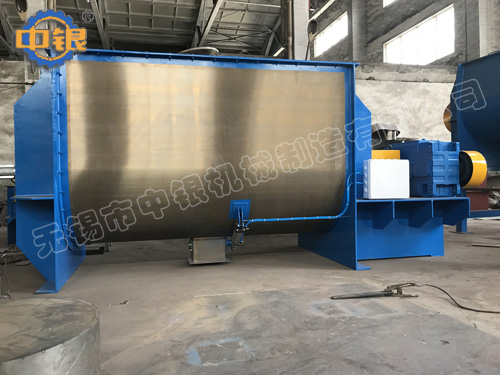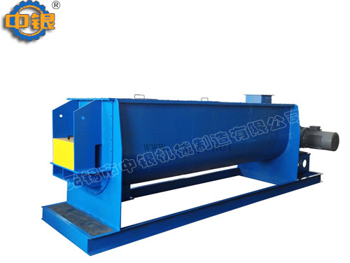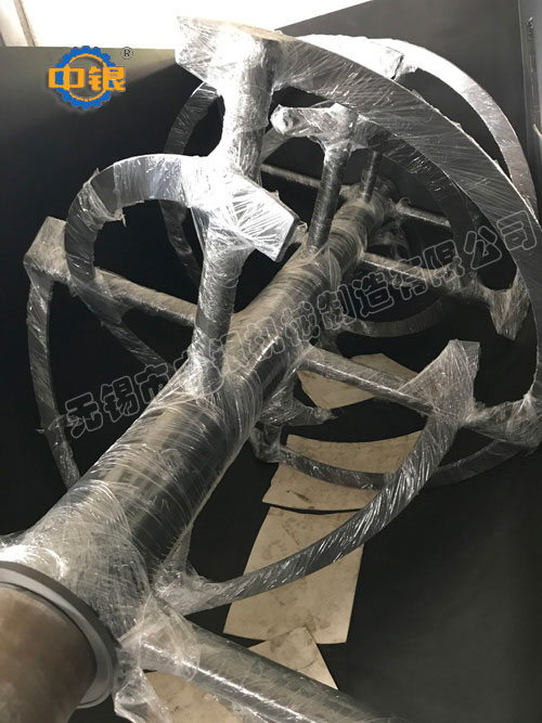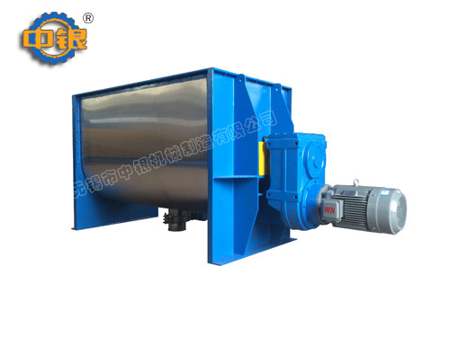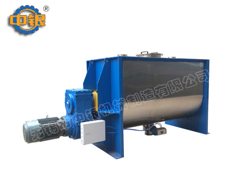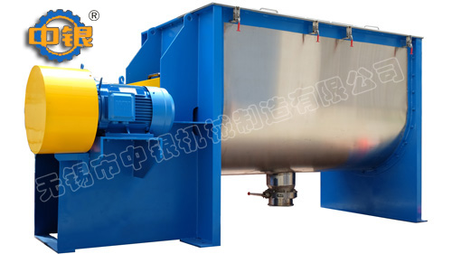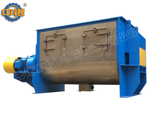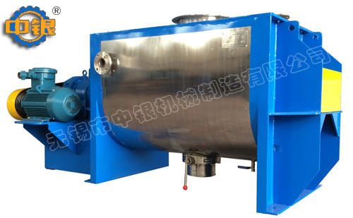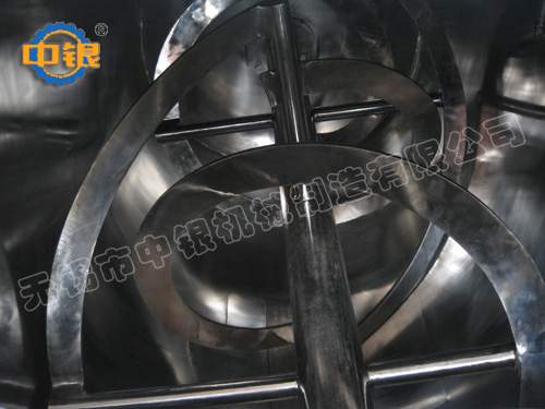 臥式螺帶混合機(jī)以高效、快速混合物料、由攪拌軸的螺旋帶運動下,使內(nèi)外螺旋帶在較大范圍內(nèi)翻動物料,內(nèi)螺旋帶將物料向兩側(cè)運動,外螺旋帶將物料由兩側(cè)向內(nèi)運動,使物料來回滲混,另部分物料被螺旋帶推動下,沒軸向徑向運動,從而形成對流循環(huán)。由于上述運動的攪拌,物料在較短時間內(nèi)獲得快速均勻混合。